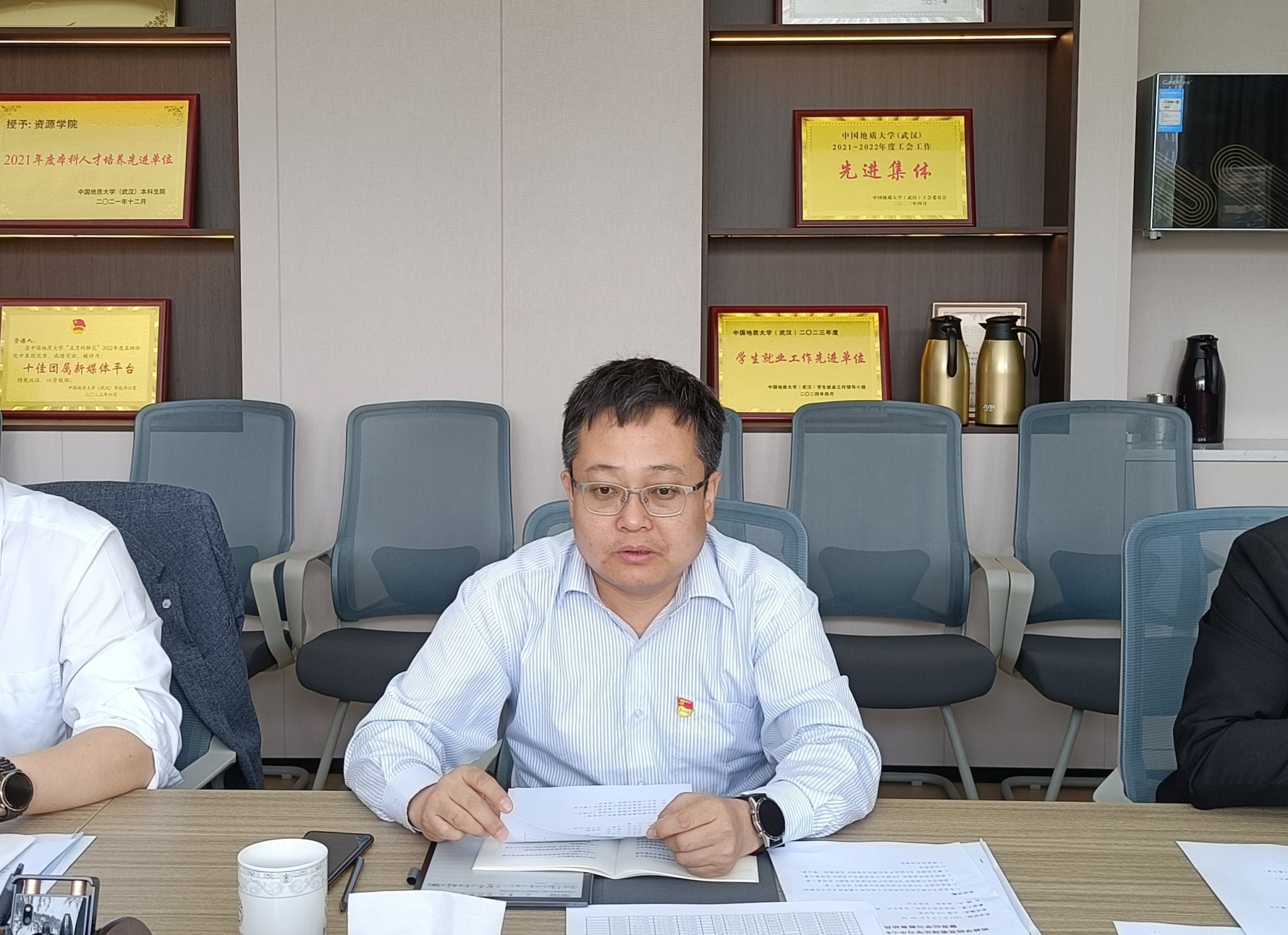 党委在主楼330室召开党纪学习教育专题读书班集中学习研讨交流会暨党委理论学习中心组(扩大)会议。成人直播党委理论学习中心组成员、党支部书记、支委委员参加会议。成人直播党委书记高复阳主持会议。