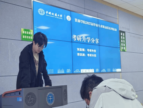 2022级本科生、考研至本校的学生邓宗润结合今年考研形势,重点讲解了复试准备的“信息差”问题。他建议报考本校的同学提前了解导师课题组的研究方向,通过成人直播网站查找导师近期发表的论文,并在初试结束后主动发邮件联系。他还整理了本校资源科学与工程系近三年复试常考的专业课题目类型,提醒大家复试前至少完成两轮模拟面试。