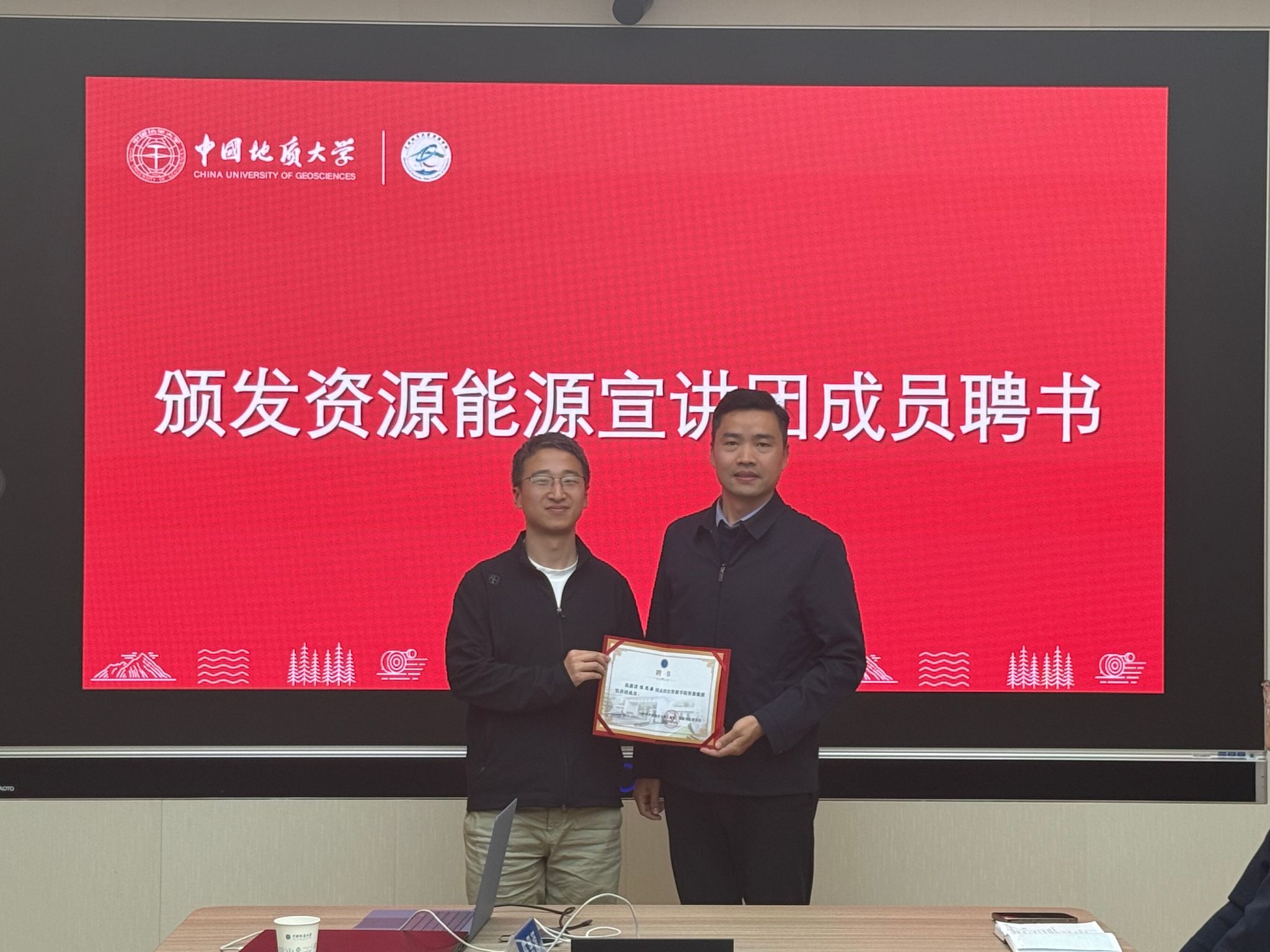 聘书颁发仪式上,成人直播副院长李占轲现场为陈思源校友颁发资源能源宣讲团成员聘书,聘请优秀校友加入成人直播宣讲队伍,发挥校友榜样示范作用,持续开展行业科普、经验分享、朋辈引领等育人工作,传承地质报国的精神。