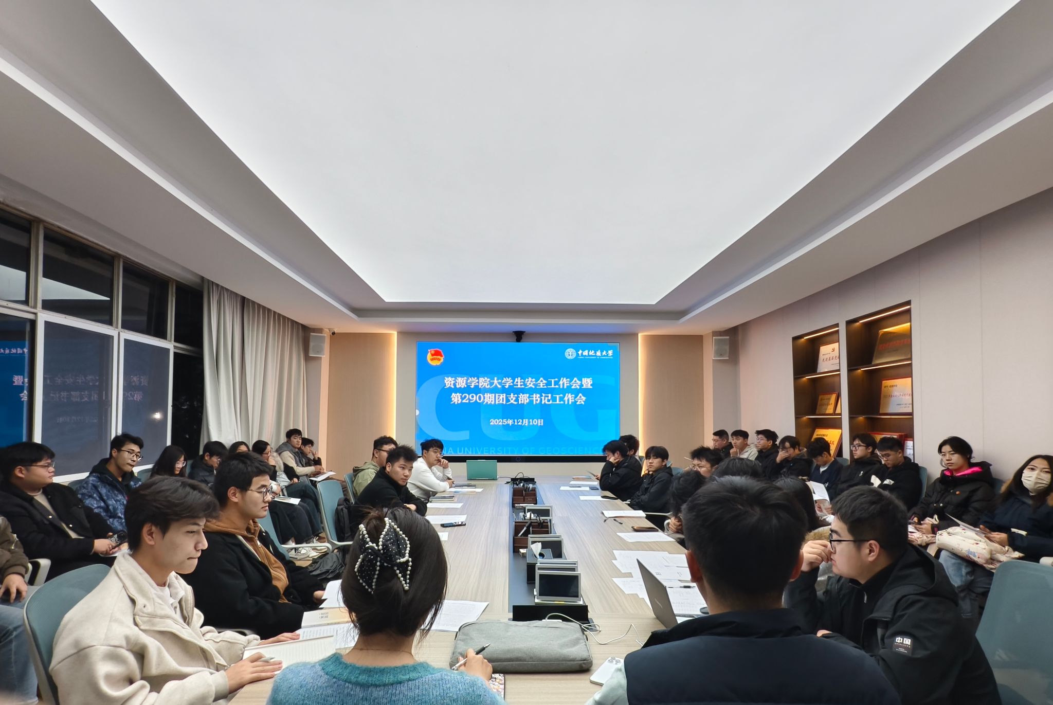 陈宇领学了《关于进一步加强学生学业诚信教育工作的通知》。林心悦就校团委发布的《关于开展2025年12月份主题团日活动的通知》重点针对各研究生团支部团日活动的开展做了提示。