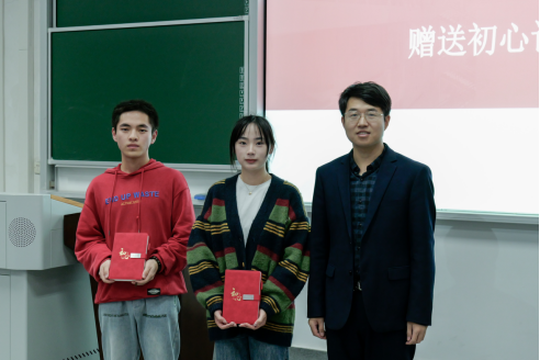 在新注册志愿者入会集中宣誓环节,霍少孟和冯思佳为2023级志协理事颁发志愿者证,红星青年志愿者协会副会长邹鑫鑫带领全体新入会志愿者集中宣誓。
